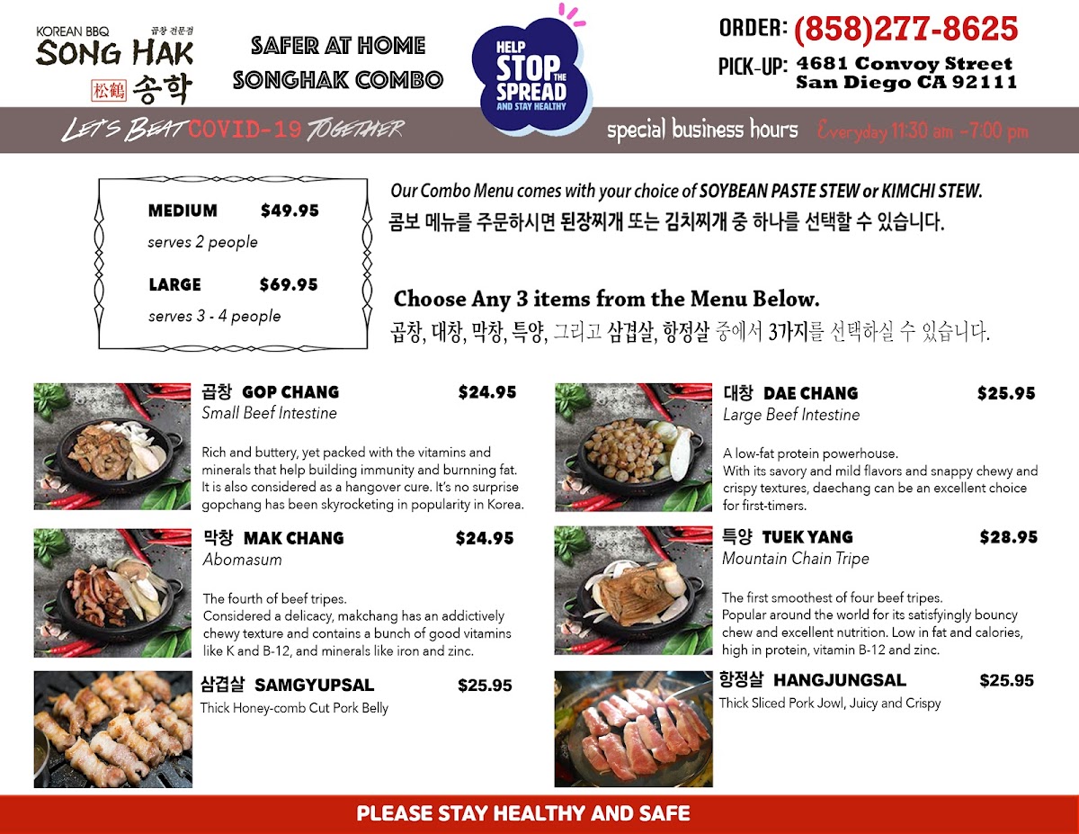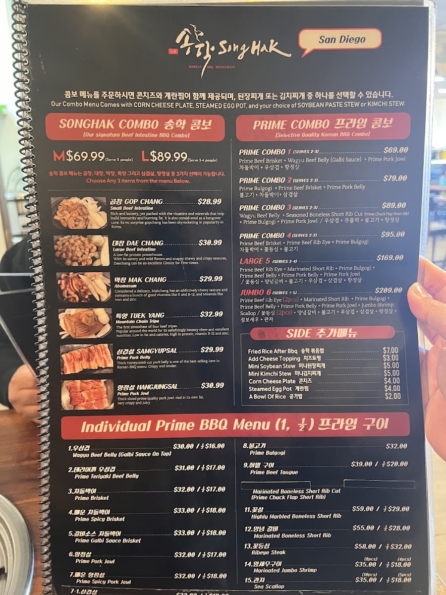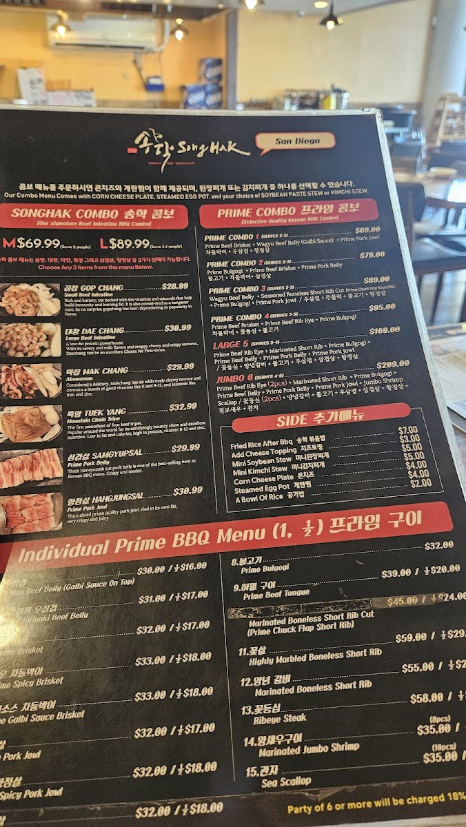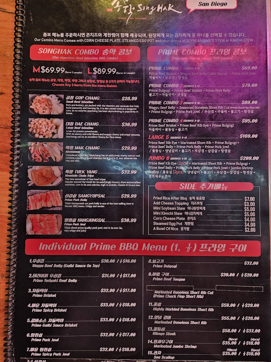 For those dining with company, the Songhak Combo and Prime Combo selections provide generous portions. The Songhak Combo includes dishes like Gop Chang (Small Beef Intestine) and Dae Chang (Large Beef Intestine), while the Prime Combo options such as Prime Combo 2 and Prime Combo 3 serve 2-3 people, ensuring everyone can enjoy a wide variety of grilled meats. For larger groups, the Large 5 (Serves 3-4) and Jumbo 6 (Serves 4-5) are ideal, offering even more substantial portions.