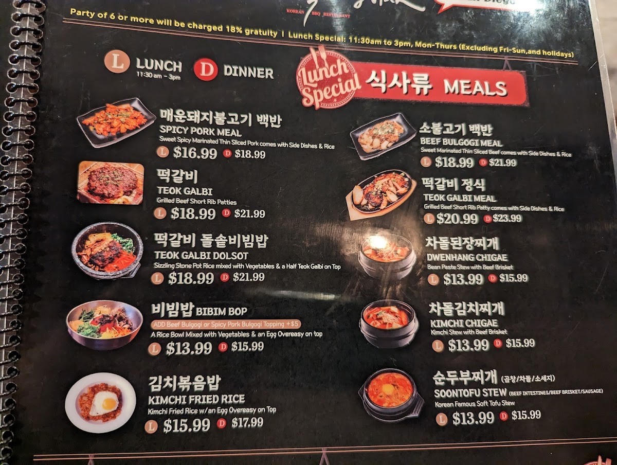For a quick lunch or dinner, the Lunch Meals and Dinner Meals section has dishes like Spicy Pork Meal and Teok Galbi, available for both lunch and dinner. The Soontofu Stew and Kimchi Chigae are also great choices for a flavorful and comforting meal.